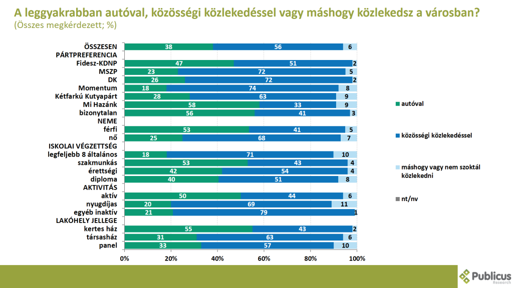 Leggyakrabban a Mi Hazánk szavazók, a bizonytalan szavazók, illetve a Fidesz szavazók közlekednek a autóval (58-56-47 százalék). Ezzel szemben például a Momentum, az MSZP és a DK szavazók közel háromnegyede a leggyakrabban a közösségi közlekedést használja (74, illetve 72-72 százalék)
