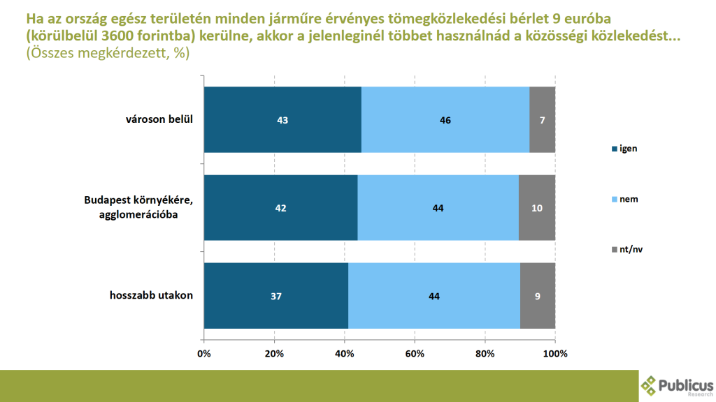 Ha az ország egész területén minden járműre érvényes tömegközlekedési bérlet 9 euróba (körülbelül 3600 forintba) kerülne, akkor tízből közel négy válaszadó a jelenleginél többet használná a közösségi közlekedést városon belül (43 százalék), Budapest környékére, agglomerációba (42 százalék) illetve hosszabb utakon (37 százalék).