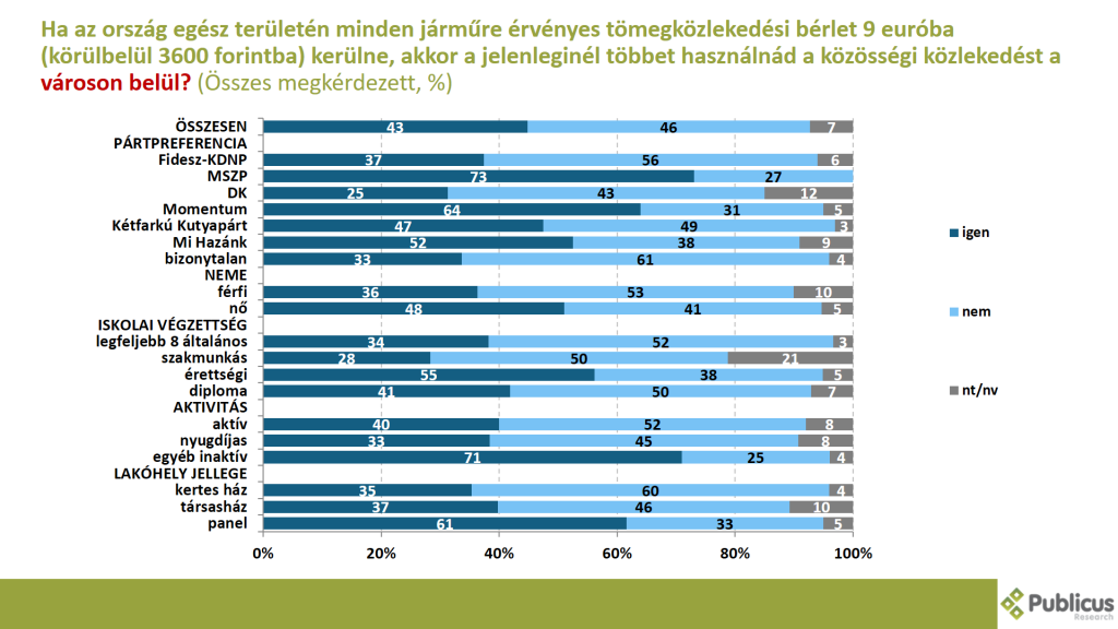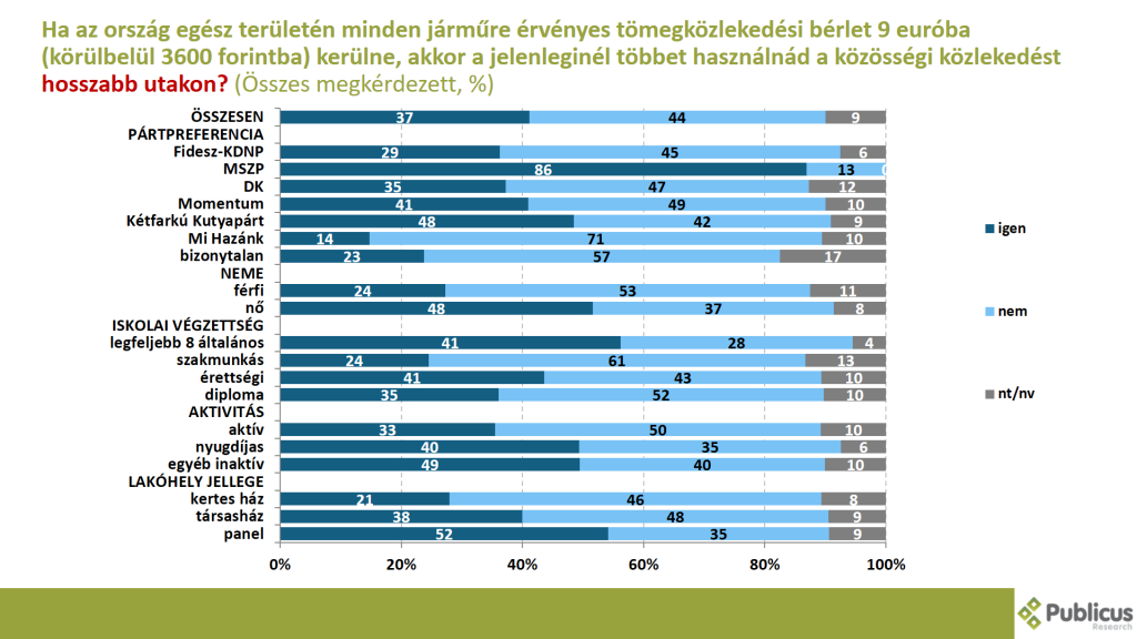 Tízből közel kilenc (86 százalék) MSZP szavazó többet használná a közösségi közlekedést hosszabb utakon is, ha bérlet 3600 forintba kerülne. A Mi Hazánk szavazók és a bizonytalan szavazók többsége (71 és 57 százalék) azonban nem tenne így. Főleg a panelban lakók (52 százalék) örülnének a javaslatnak.