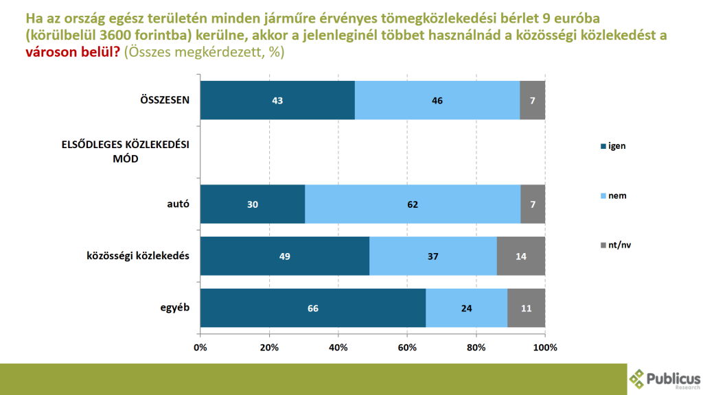 Ilyen árak mellett tízből három autós (30 százalék), minden második (49 százalék) tömegközlekedést használó, illetve az egyéb módon közlekedők (például gyalogosok, biciklisek) kétharmada (66 százalék) szintén többet használná a közösségi közlekedést a városon belül.