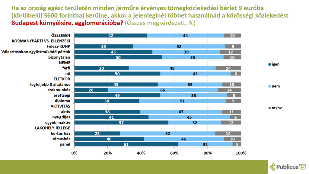 Tízből közel kilenc (86 százalék) MSZP szavazó, illetve a Kétfarkú Kutyapárt szavazóinak az enyhe többsége (53 százalék) többet használná a közösségi közlekedést Budapest környékére, az agglomerációba, ha bérlet 3600 forintba kerülne. A Mi Hazánk, a bizonytalan szavazók és a Fidesz szavazók többsége (63-53-51 százalék) azonban nem tenne így.