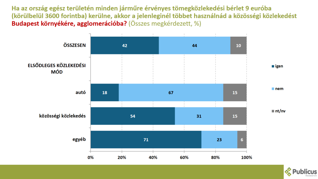 Ilyen árak mellett tízből kettő autós (18 százalék) a tömegközlekedést használók többsége (54 százalék), illetve az egyéb módon közlekedők (például gyalogosok, biciklisek) közül tízből heten (71 százalék) szintén többet használnák a közösségi közlekedést Budapest környékére, az agglomerációba.