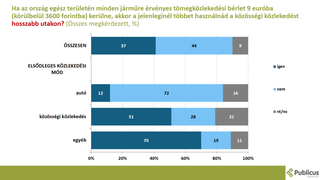 Ilyen árak esetén minden nyolcadik (12 százalék) autós, mindem második (51 százalék) tömegközlekedést használó, illetve az egyéb módon közlekedők (például gyalogosok, biciklisek) közül tízből heten (70 százalék) szintén többet használnák a közösségi közlekedést a hosszabb utakon.