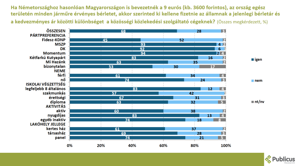 Ha Németországhoz hasonlóan Magyarországon is bevezetnék a 9 eurós (kb. 3600 forintos), az ország egész területén minden járműre érvényes bérletet, akkor tízből hét (68 százalék) megkérdezett szerint az államnak ki kellene fizetnie a jelenlegi bérletár és a kedvezményes ár közötti különbséget a közösségi közlekedési szolgáltató cégeknek. Így gondolja szinte majdnem az összes Momentum, MSZP és DK szavazó (94-93-92 százalék). A Fidesz szavazók enyhe többsége (52 százalék) szerint azonban ebben az esetben az államnak nem kellene közbelépnie.