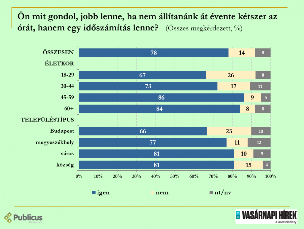 A megkérdezettek háromnegyede (78 százalék) szerint jobb lenne, ha nem állítanánk át évente kétszer az órát, hanem egy időszámítás lenne hazánkban, és Európában. Mindössze 14 százalék gondolja másként.
