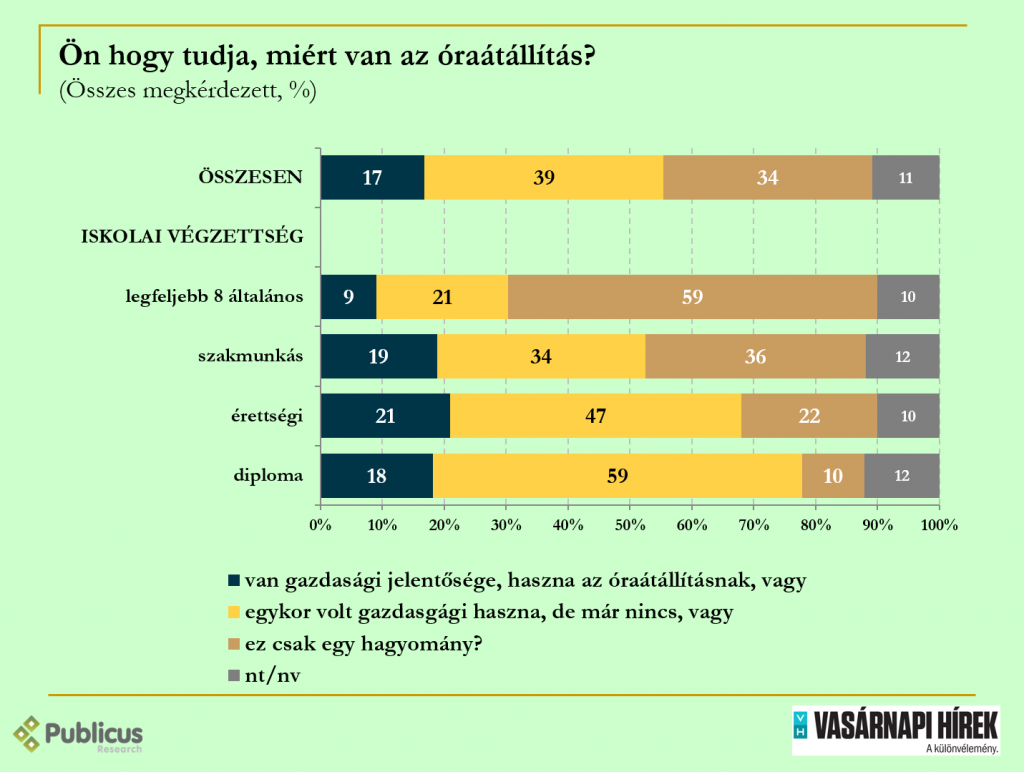 Leginkább a 8 általánost, vagy kevesebbek végzettek tudják úgy, hogy az óraátállítás csupán egy hagyomány (59 százalék), míg a diplomásoknak csak tizede (10 százalék). Mindeközben tíz diplomásból hat (59 százalék) úgy tudja, hogy egykor talán volt gazdasági haszna az óraátállításnak, de ma már nincs, addig tízből kettő (21 százalék) 8 általános végzett véli így.
