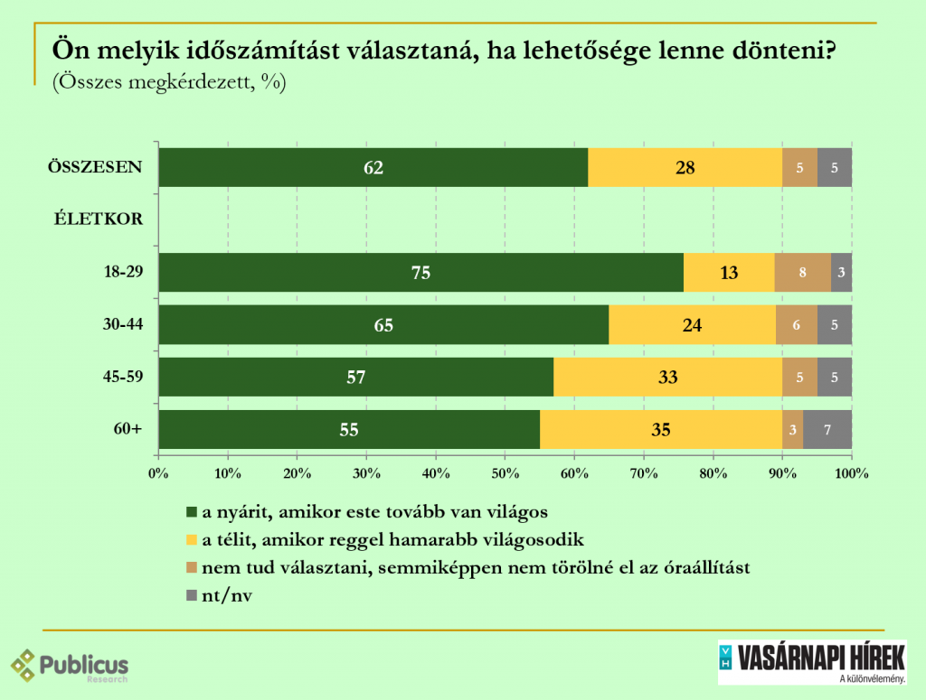 A válaszadók kétharmada (62 százalék) szerint a nyári időszámítást kellene megtartani, amikor este tovább van világos. Tízből hárman (28 százalék) vannak — az egyébként „eredeti” — téli időszámítás mellett. Egy korcsoportos törésvonalat figyelhetünk meg: bár minden korcsoportban többségben vannak azok akik inkább a nyári időszámítást választanák, a 30 évnél fiatalabbak körében háromnegyedes (75 százalék) döntene így, a 60 évesnél idősebbek körében kicsivel több, mint a felük (55 százalék, 35 ellenében).