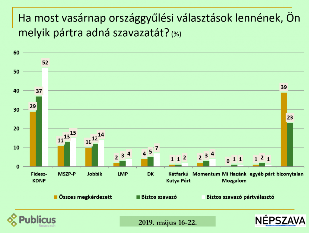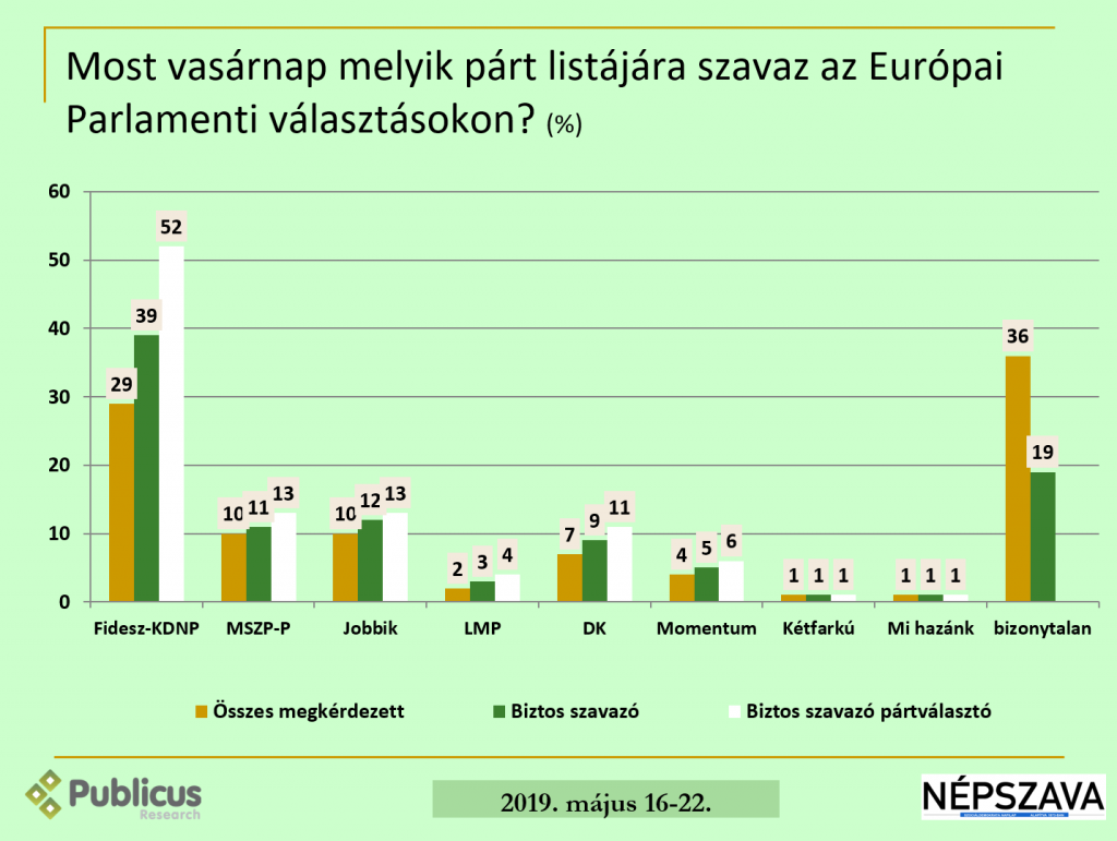 Publicus Intézet Népszava megbízásából május 16-22 között, 999 fő megkérdezésével készített reprezentatív közvéleménykutatásban vizsgálta a pártok támogatottságának alakulását az Európai Parlamenti választások esetén. ——————————–