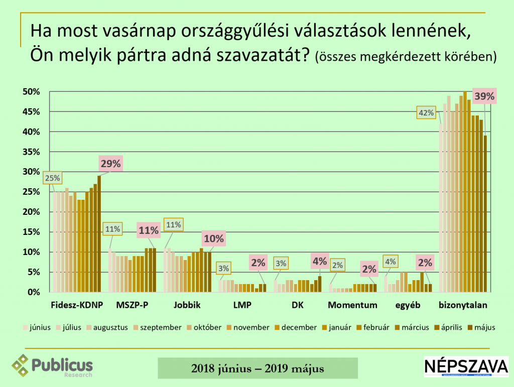 Pártok EP és országgyűlési támogatottsága — 2019. május