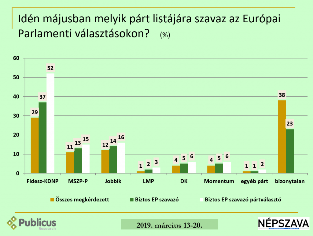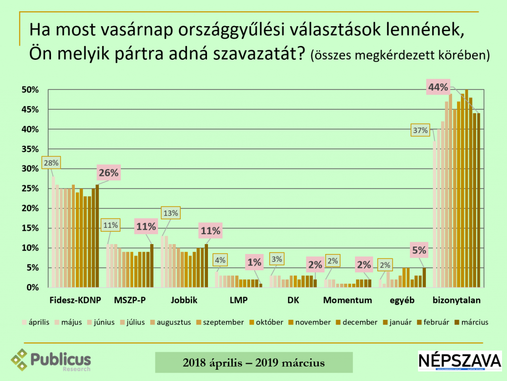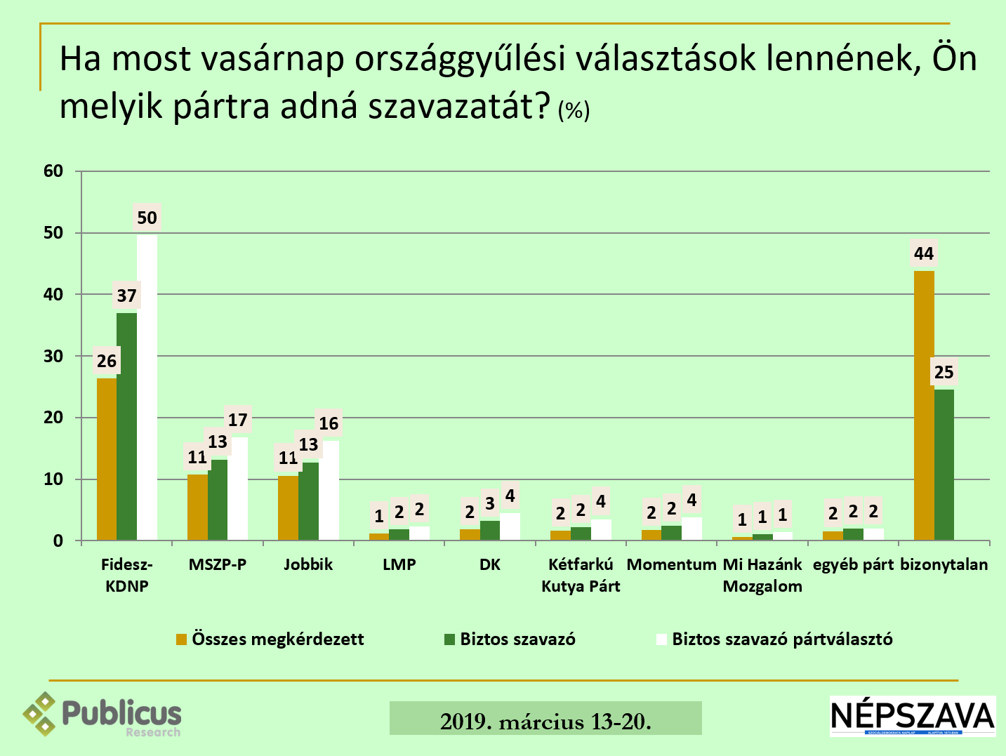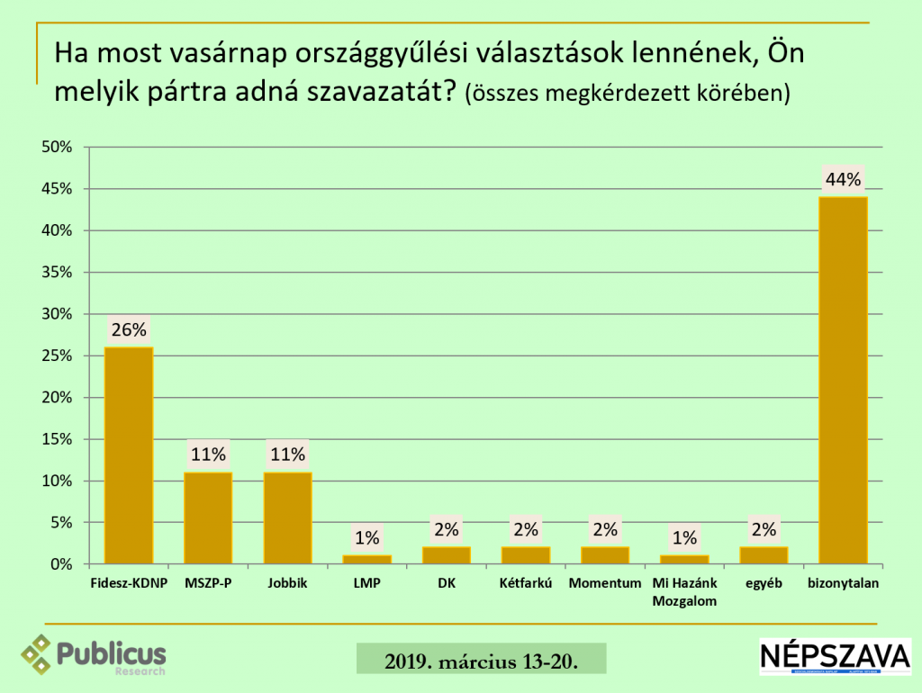 A Publicus Intézet a Népszava megbízásából március 13-20 között, 1001 fő megkérdezésével készített reprezentatív közvéleménykutatásban vizsgálta a pártok támogatottságának alakulását az országgyűlési és az Európai Parlamenti választások esetén. Országgyűlési választások esetén a Fidesz-KDNP támogatottsága 26 százalék, az MSZP-P támogatottsága 11, és a Jobbiké 11 százalék.