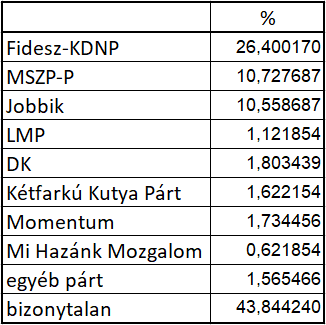 Az LMP és a DK támogatottsága is 1-1 százalékpontot csökkent, és 1, illetve 2 százalék. Az LMP esetében ez az elmúlt években mért legalacsonyabb érték. A Kétfarkú Kutya párt és a Mi Hazánk Mozgalom Párt támogatottsága 1-1 százalékpontot növekedett, így 2, illetve 1 százalék. A Momentum támogatottsága nem változott, az 2 százalék. A bizonytalanok aránya az elmúlt hónapok csökkenése után most nem változott, 44 százalék.