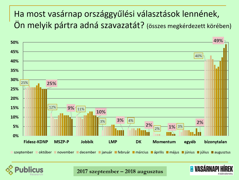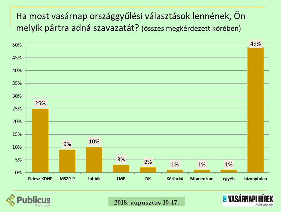A Publicus Intézet a Vasárnapi Hírek megbízásából, augusztus 10. és 17. között, 998 fő megkérdezésével készített reprezentatív közvéleménykutatásban vizsgálta a pártok támogatottságának alakulását. Fidesz-KDNP támogatottsága 25 százalék, az MSZP-P támogatottsága 9, a Jobbiké 10 százalék.
