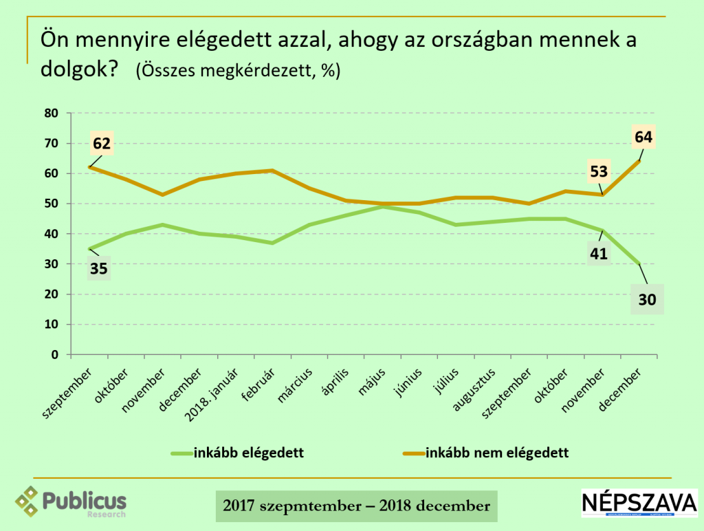 A elmúlt hónapban drasztikusan, 41 százalékról, 30 százalékra, 11 százalékponttal csökkent azok aránya akik elégedettek a hazánkban zajló folyamatokkal. Ezzel párhuzamosan, hasonló arányban, 11 százalékponttal, 53 százalékról 64 százalékra növekedett az elégedetlenek aránya. Ilyen mértékű elmozdulás egy hónapon belül különösen ritka; ezzel a változással a másfél évvel ezelőtti szintre ment vissza a mutató.