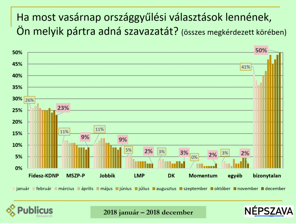 Az LMP támogatottsága nem változott, és 2 százalék, a DK esetében viszont egy százalékpontot növekedett, és így 3 százalék. A Kétfarkú Kutya párt egy százalékpontot csökkent, így 1 százalék, míg a Momentum ugyan ennyit növekedett, így 2 százalék a támogatottság. A Mi hazánk mozgalom párt támogatottsága a múlt hónapokban stabilan elérte az 1 százalékot, ám ez most csökkent, és az MLP-hez hasonlóan nem érte el az ábrázoláshoz szükséges értéket. Az Együttet megszűnése okán 2018 júniustól nem mérjük. A bizonytalanok aránya az elmúlt hónapok növekedés után, most újra egy százalékpontot növekedett, 50 százalék.