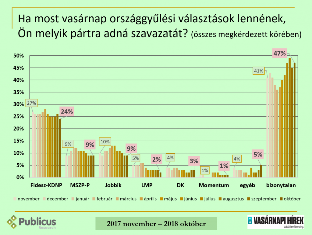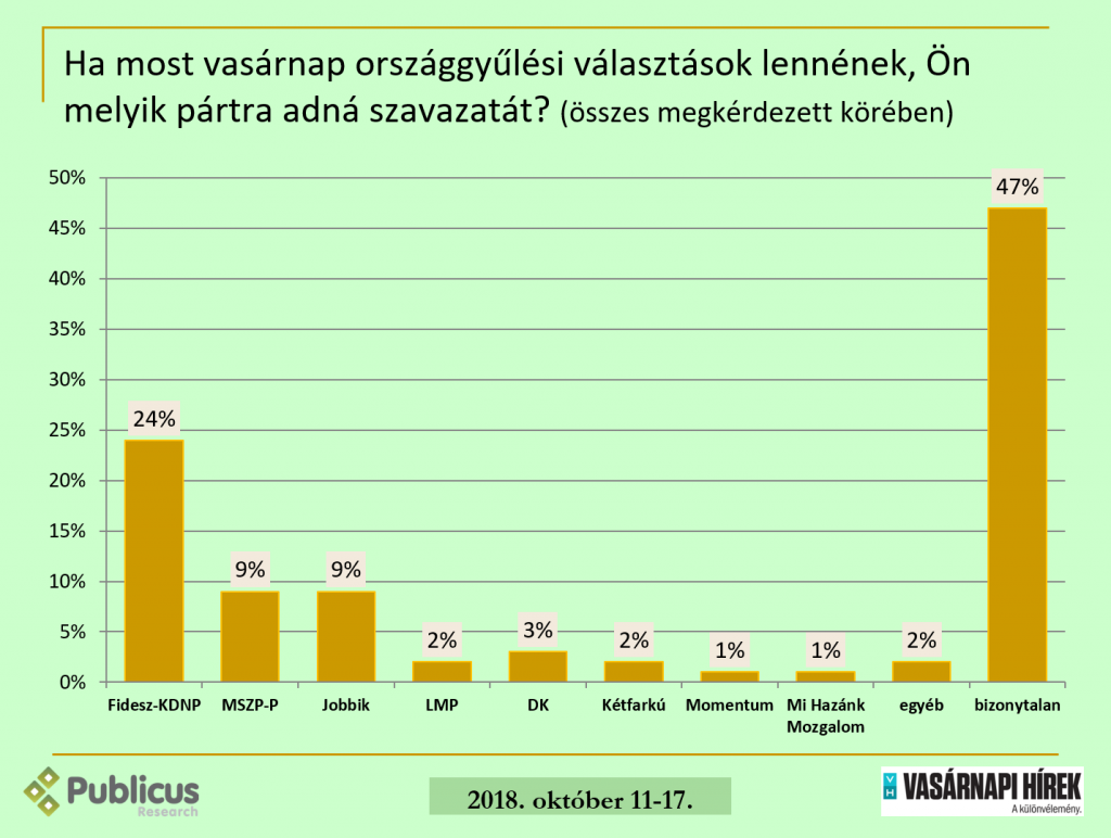 A Publicus Intézeta Vasárnapi Hírek megbízásából október 11. és 17. között 1007 fő megkérdezésével készített reprezentatív közvéleménykutatásban vizsgálta a pártok támogatottságának alakulását. Fidesz-KDNP támogatottsága 24 százalék, az MSZP-P és a Jobbiké 9 százalék.