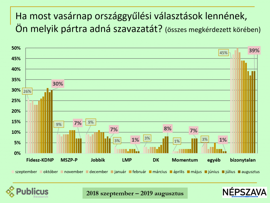 A Publicus Intézet a Népszava megbízásából augusztus 12-27 között, 1001 fő megkérdezésével készített reprezentatív közvéleménykutatásban vizsgálta a pártok támogatottságának alakulását. A Fidesz-KDNP támogatottsága 30 százalék, az MSZP-P, a Jobbik és Momentum támogatottsága 7, a DK támogatottsága 8 százalék.