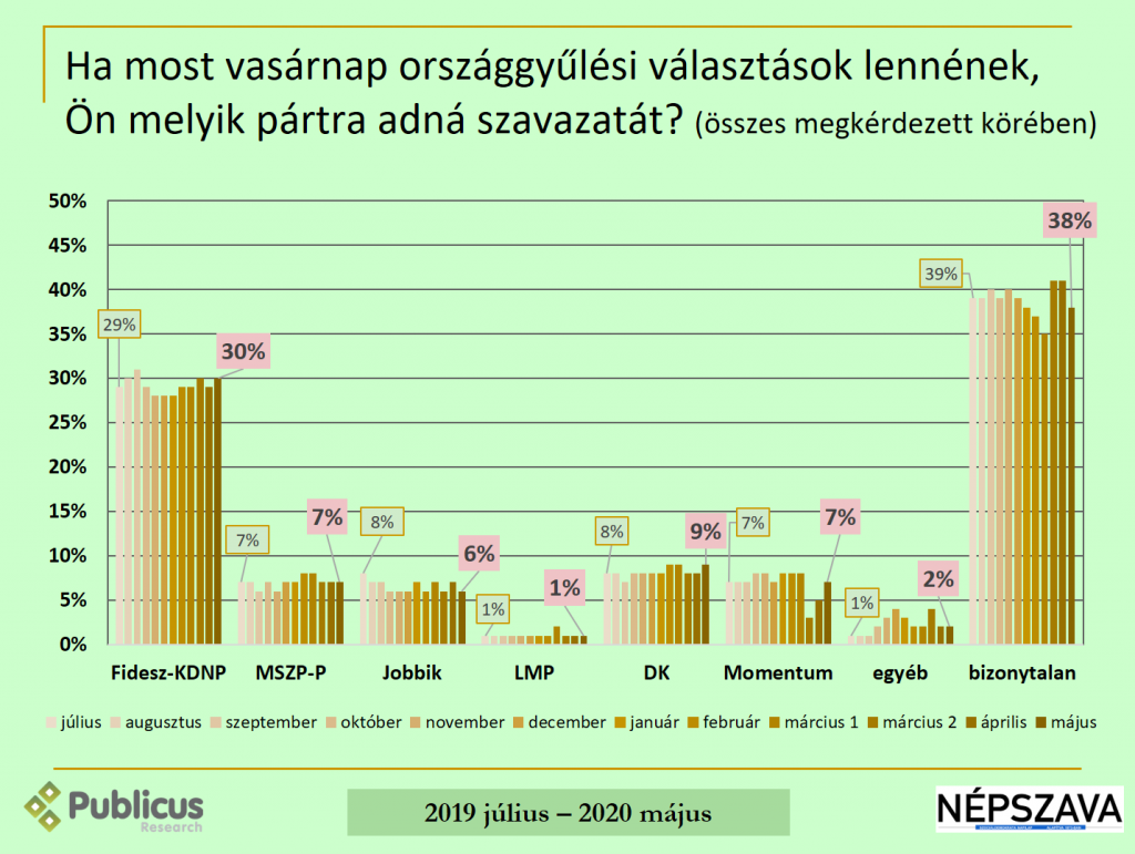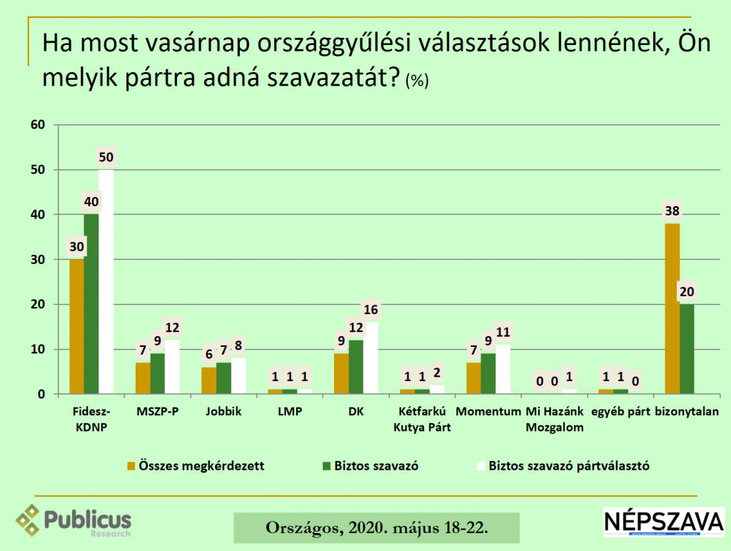 A Publicus Intézet a Népszava megbízásából május 18 – 22. között 998 fő megkérdezésével készített országos reprezentatív közvéleménykutatásban vizsgálta a pártok támogatottságát.