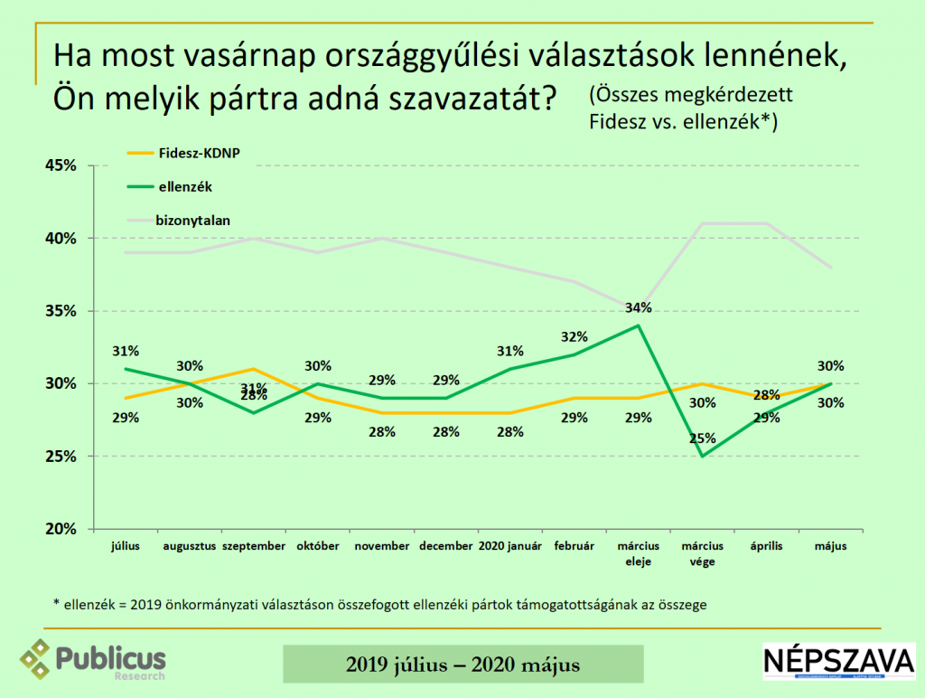 A 2019-es októberi önkormányzati választásokon együttműködő ellenzéki erők összesített támogatottsága a koronavírus-járvány érkezése előtti három hónapban folyamatosan, összesen 5 százalékpontot növekedett, azonban a járvány okán az elsősorban a bizonytalanok köréből gyűjtött szavazói bázis nem tudott megszilárdulni, és újra bizonytalanná vált – összességében kilenc százalékpontot csökkent ezen erők összesített támogatottsága.