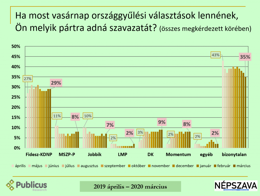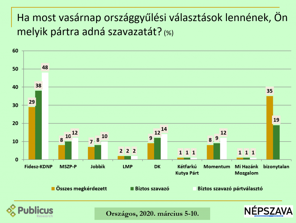 A Publicus Intézet a Népszava megbízásából március 5-10 között 1009 fő megkérdezésével készített országos reprezentatív közvéleménykutatásban vizsgálta a pártok támogatottságát.