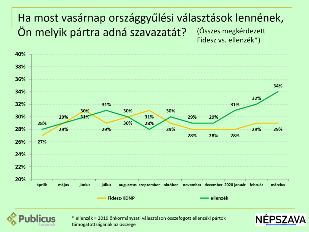 A 2019-es októberi önkormányzati választásokon együttműködő ellenzéki erők összesített támogatottsága az elmúlt három hónapban folyamatosan, összesen 5 százalékpontot növekedett, így 34 százalék. Míg a Fidesz támogatottsága stagnált, és 29 százalékos. Így az összes megkérdezett körében hibahatáron túlra növekedett a különbség a két oldal között.