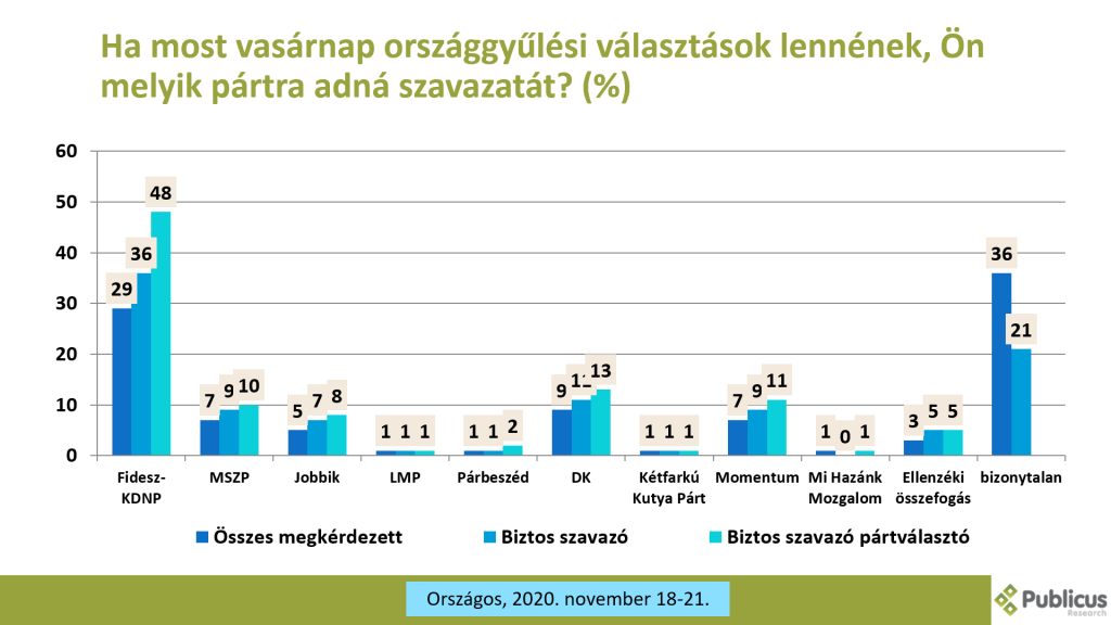 A Publicus Intézet a Népszava megbízásából november 18 – 21. között 1005 fő megkérdezésével készített országos reprezentatív közvéleménykutatásban vizsgálta a pártok támogatottságát.