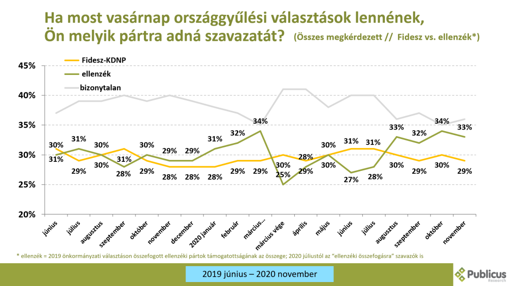Az elmúlt hónapokban, mióta megjelentek a járvány nyomán a gazdasági és szociális válság tünetei, kiéleződik a kormány és az ellenzéki önkormányzatok szembenállása, illetve az ellenzéki erők hatékonyabban kommunikálják összefogási szándékukat megfordult a Fidesz-ellenzék erősorrend. Októberben és novemberben már hibahatáron túl, 4 százalékponttal magasabb az összefogásra készülő ellenzék támogatottsága, mint a Fideszé.