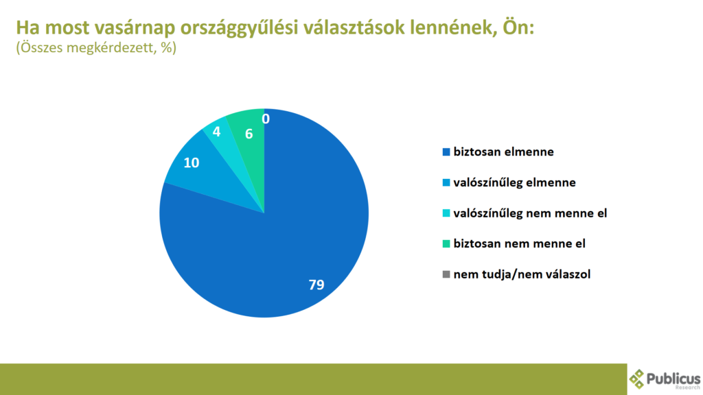 Ha most vasárnap országgyűlési választások lennének, tízből nyolc (79 százalék) válaszadó mondta azt, hogy biztosan elmenne választani, tízből egy (10 százalék) pedig valószínűleg így tenne.