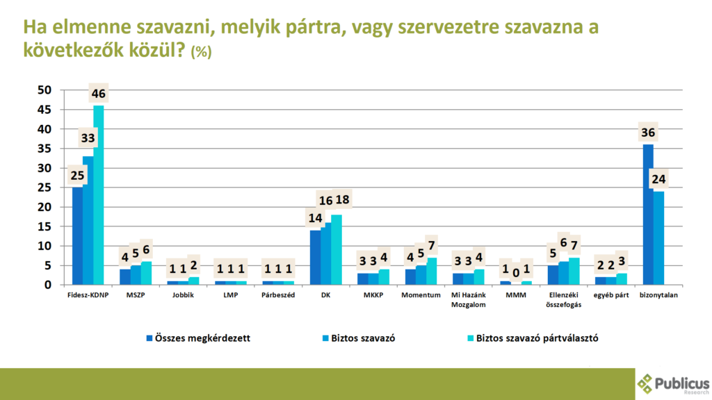 A DK 14 százalékon, a Momentum és az MSZP 4-4 százalékon, a Mi Hazánk és a Kétfarkú Kutyapárt 3-3 százalékon, a Jobbik, az LMP és a Párbeszéd pedig 1-1-1 százalékon áll szintén az összes megkérdezett körében.