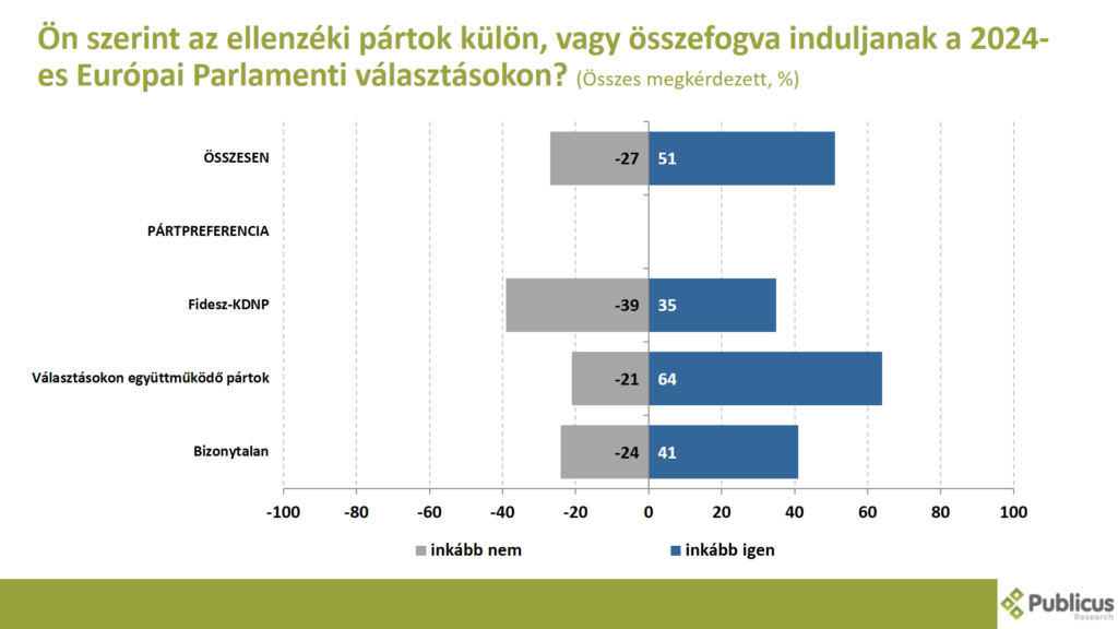 Minden második (51 százalék) megkérdezett mondta azt, hogy inkább összefogva induljanak az ellenzéki pártok a 2024-es Európai Parlamenti választáson. A választásokon együttműködő ellenzéki pártok szavazóinak közel kétharmada (64 százalék) nyilatkoztak így. A bizonytalan szavazóknál 41 százalék ez az arány, a Fidesz szavazóknál pedig 35 százalék.