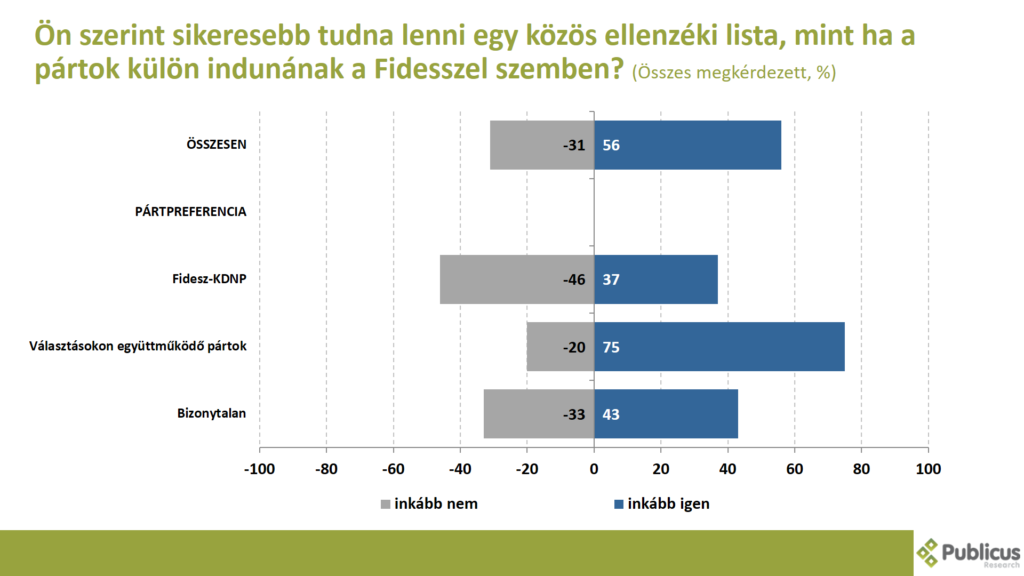 A többség (56 százalék) szerint sikeresebb tudna lenni egy közös ellenzéki lista, mint ha a pártok külön indulnának a Fidesszel szemben. Így gondolja a választásokon együttműködő ellenzéki pártok szavazóinak háromnegyede (75 százalék), tízből négy (43 százalék) bizonytalan szavazó, illetve tízből közel négy (37 százalék) Fidesz szavazó.