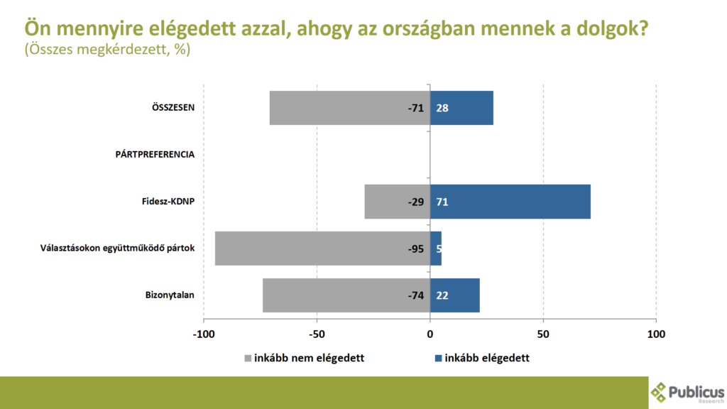 Tízből hét (71 százalék) megkérdezett inkább nem elégedett azzal, ahogy az országban mennek a dolgok. Így nyilatkozott a választásokon együttműködő ellenzéki pártok szavazói közül szinte az összes (95 százalék), a bizonytalan szavazók háromnegyede (74 százalék), illetve tízből három (29 százalék) Fidesz szavazó.