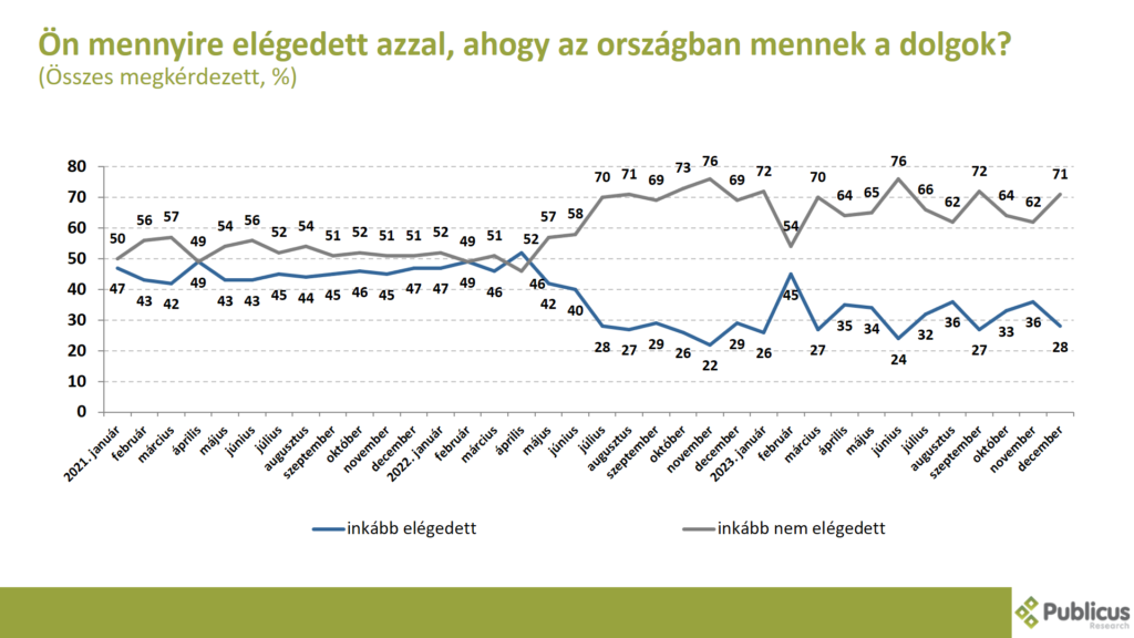 Az elmúlt két évben az elégedettség egyedül a választás hónapjában volt a pozitív tartományban, ám a választás óta drámaian csökkent. Míg 2022 áprilisában csupán 46 százalék volt az elégedetlenek aránya, addig 2023 novemberében 62 százalék volt ez az arány. Az elmúlt egy hónapban 9 százalékponttal emelkedve 71 százalékra növekedett az elégedetlenek aránya.