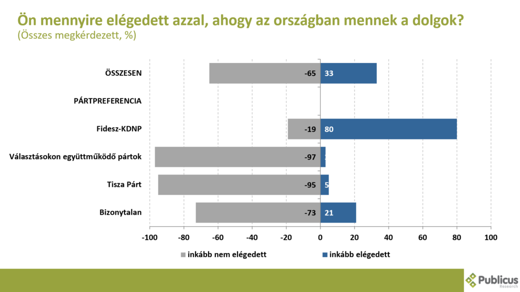 A megkérdezett kétharmada (65 százalék) inkább nem elégedett azzal, ahogy az országban mennek a dolgok. Így nyilatkozott a választásokon együttműködő ellenzéki pártok szavazói, illetve a Tisza Párt szavazói közül szinte az összes (97 és 95 százalék), a bizonytalan szavazók háromnegyede (73 százalék), illetve minden ötödik (19 százalék) Fidesz szavazó.