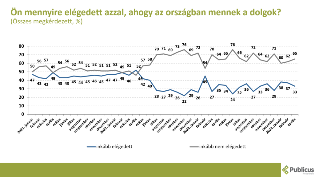 2021 januárja óta az elégedettség egyedül a 2022-es választás hónapjában volt a pozitív tartományban, ám azóta drámaian csökkent. Míg 2022 áprilisában csupán 46 százalék volt az elégedetlenek aránya, addig 2023 novemberében 62 százalék volt ez az arány. 2024 januárja óta 5 százalékponttal növekedett az elégedetlenek aránya (60 százalékról 65 százalékra).