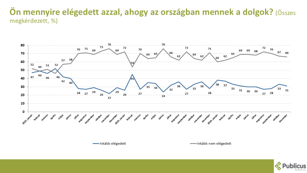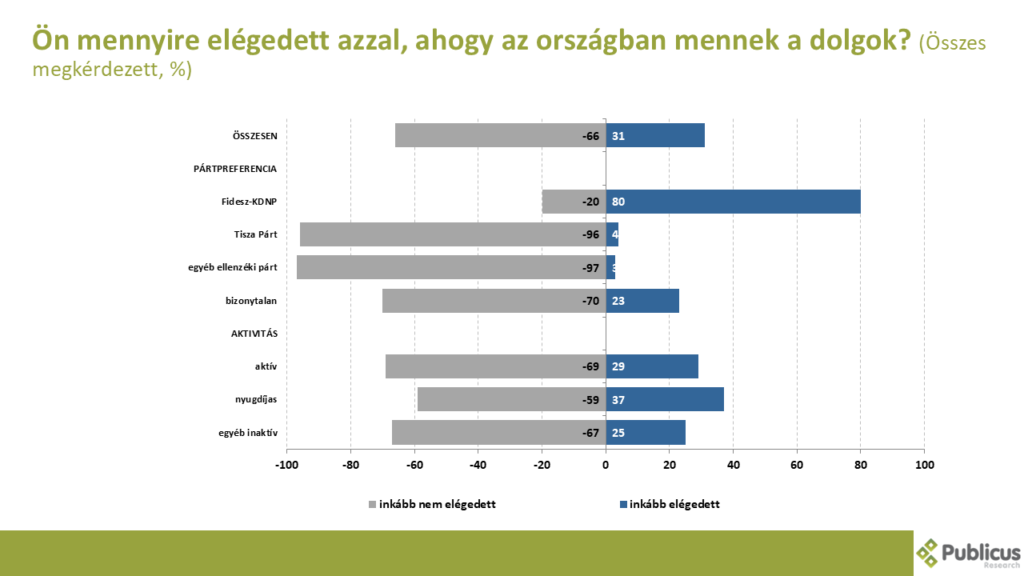 A válaszadók kétharmada (66 százalék) inkább nem elégedett azzal, ahogy az országban mennek a dolgok. Szinte mind így nyilatkoztak a Tisza Párt szavazói és az egyéb ellenzéki pártok szavazói (96 és 97 százalék), tízből hét pártnélküli szavazó (70 százalék), illetve a Fidesz szavazóinak 20 százaléka.