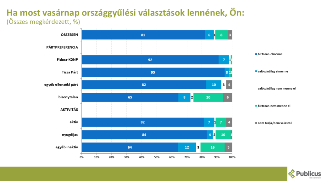 Az év végére kissé csökkent a válaszadók politikai részévteli szándéka: egy most vasárnap tartott országgyűlési választáson a megkérdezettek 81 százaléka venne biztosan részt – 10 százalékponttal kevesebben, mint októberben. Legmagasabb arányban a Tisza Párt szavazói vennének részt (95 százalék), de a kormánypárt szavazói sem sokkal kevésbé elszántak (92 százalékuk menne el szavazni). Ez az arány valamivel alacsonyabb az egyéb ellenzéki pártok szavazói között (82%), de nem meglepő módon legkisebb arányban (65 százalék) a bizonytalan szavazók mondták biztosra a részvételüket.