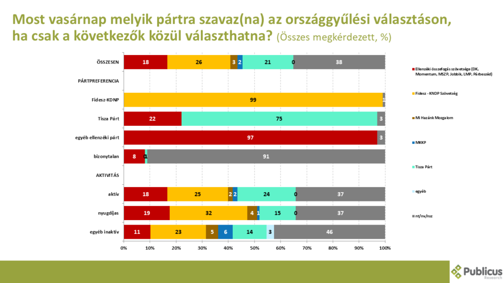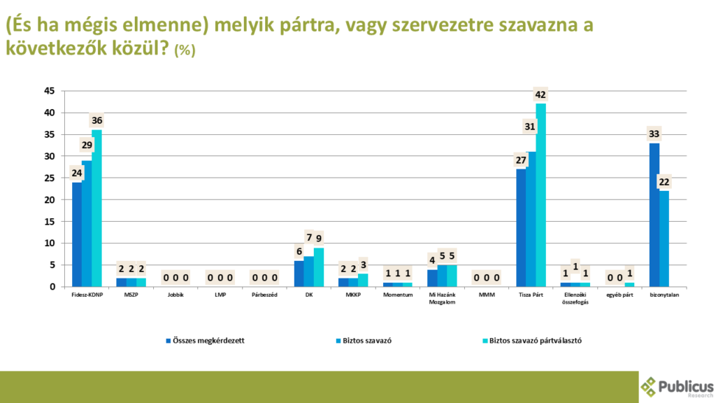 A Tisza Párt továbbra is vezet a Fidesz előtt, habár a biztos szavazók között még hibahatáron belül. A Tisza Párt a biztos szavazók körében 31, míg a Fidesz 29, a biztos pártválasztók között pedig 42 míg a Fidesz 36 százalékos támogatottsággal rendelkezik. Az összes megkérdezett körében pedig jelenleg a válaszadók 27 százaléka a Tisza Pártra, 24 százaléka pedig a kormánypártra voksolna egy most vasárnap tartott választáson. Az egyéb ellenzéki pártok közül jelenleg csupán a Demokratikus Koalíció támogatottsága (6%) lépi át a parlamenti bejutási küszöböt. A válaszadók egyharmada (33%) azonban továbbra is bizonytalan abban, hogy kire szavazna – a két nagy pártnak elsősorban őket kell majd meggyőzniük a következő hónapokban.