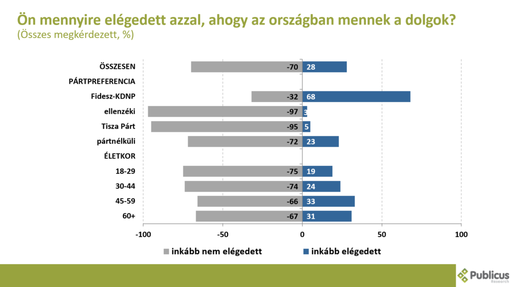Tíz megkérdezettből hét (70 százalék) inkább nem elégedett azzal, ahogy az országban mennek a dolgok. Így nyilatkozott a választásokon együttműködő ellenzéki pártok szavazói, illetve a Tisza Párt szavazói közül szinte az összes (97 és 95 százalék), a bizonytalan szavazók közel háromnegyede (72 százalék), illetve minden harmadik (32 százalék) Fidesz szavazó. Minél fiatalabb a válaszadó, annál inkább elégedetlenebb.