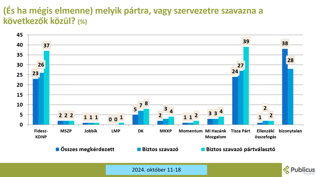 A Tisza Párt 24 százalékon, a DK pedig 5 százalékon áll.