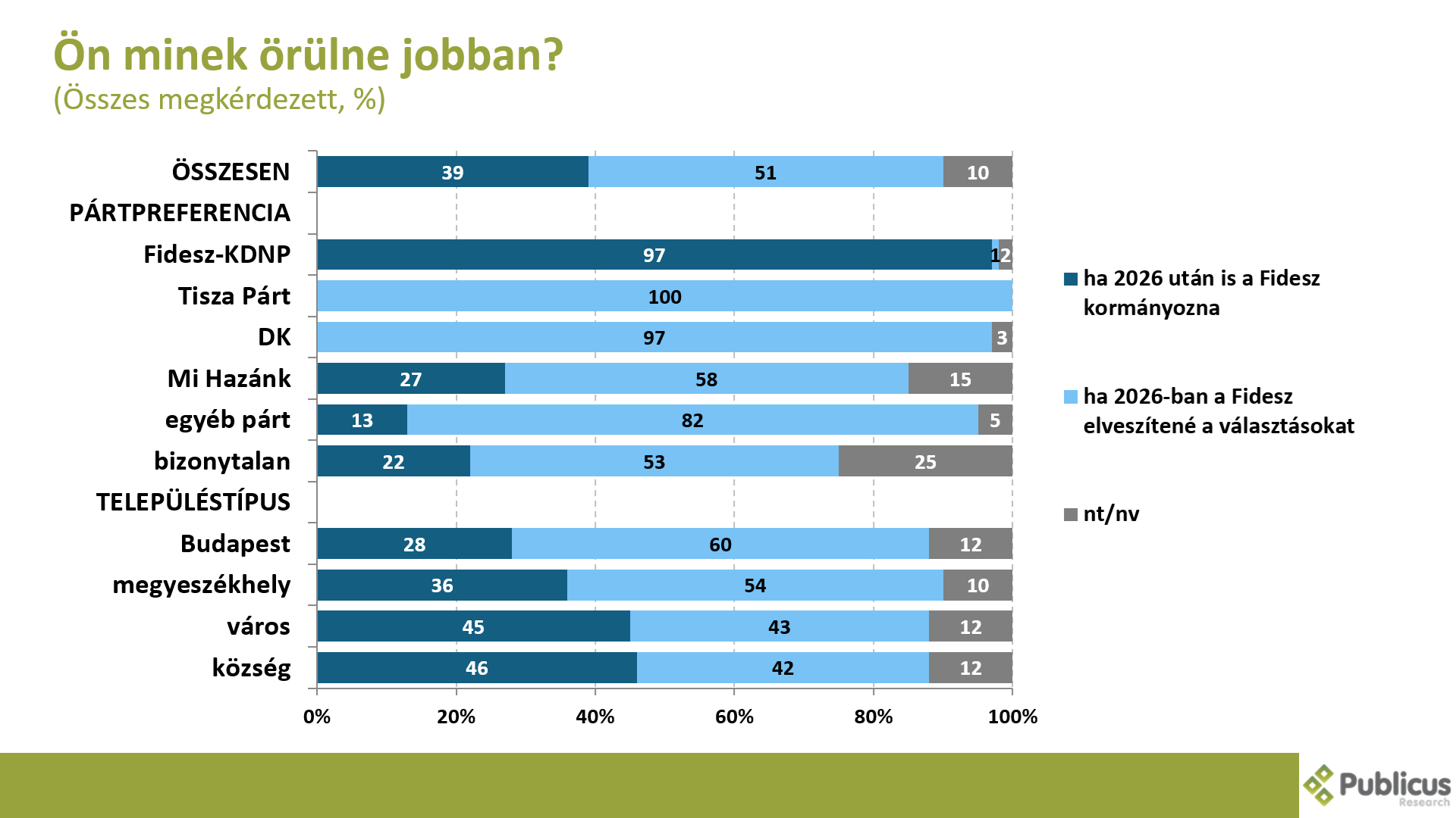 A válaszadók több mint fele (51 százaléka) jobban örülne, ha a Fidesz 2026-ban elveszítené a választásokat. A megkérdezettek többsége minden politikai táborból így nyilatkozott – a kormánypárt saját szavazóit leszámítva. Rajtuk kívül szintén egy újabb Fidesz kormánynak örülne jobban a Mi Hazánk szavazóinak bő negyede (27 százalék), a bizonytalan szavazók 22 százaléka, illetve az egyéb pártok támogatóinak 13 százaléka. A mintában minél kevésbé urbánus volt egy válaszadó, annál nagyobb valószínűséggel preferálna egy újabb Fidesz győzelmet 2026-ban.