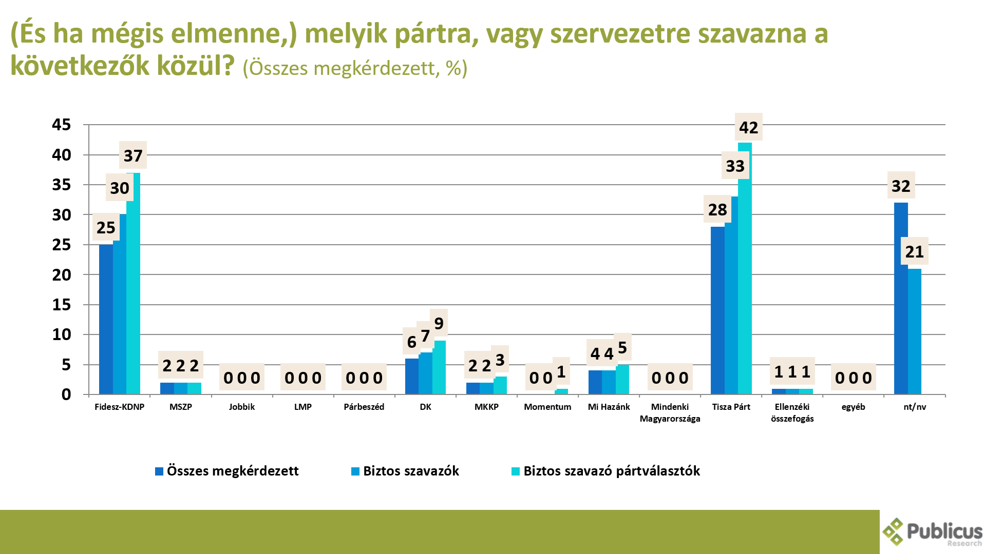 A Tisza Párt népszerűbb a Fidesznél, minden kategóriában hibahatáron túl. A Tisza Párt a biztos szavazók körében 33, míg a Fidesz 30, a biztos pártválasztók között pedig 42 míg a Fidesz 37 százalékos támogatottsággal rendelkezik. Az összes megkérdezett körében jelenleg a válaszadók 28 százaléka a Tisza Pártra, 25 százaléka pedig a jelenlegi kormánypártra voksolna egy most vasárnap tartott választáson. Az egyéb ellenzéki pártok közül jelenleg csupán a Demokratikus Koalíció támogatottsága (6% az összes megkérdezett körében) lépi át a parlamenti bejutási küszöböt.
