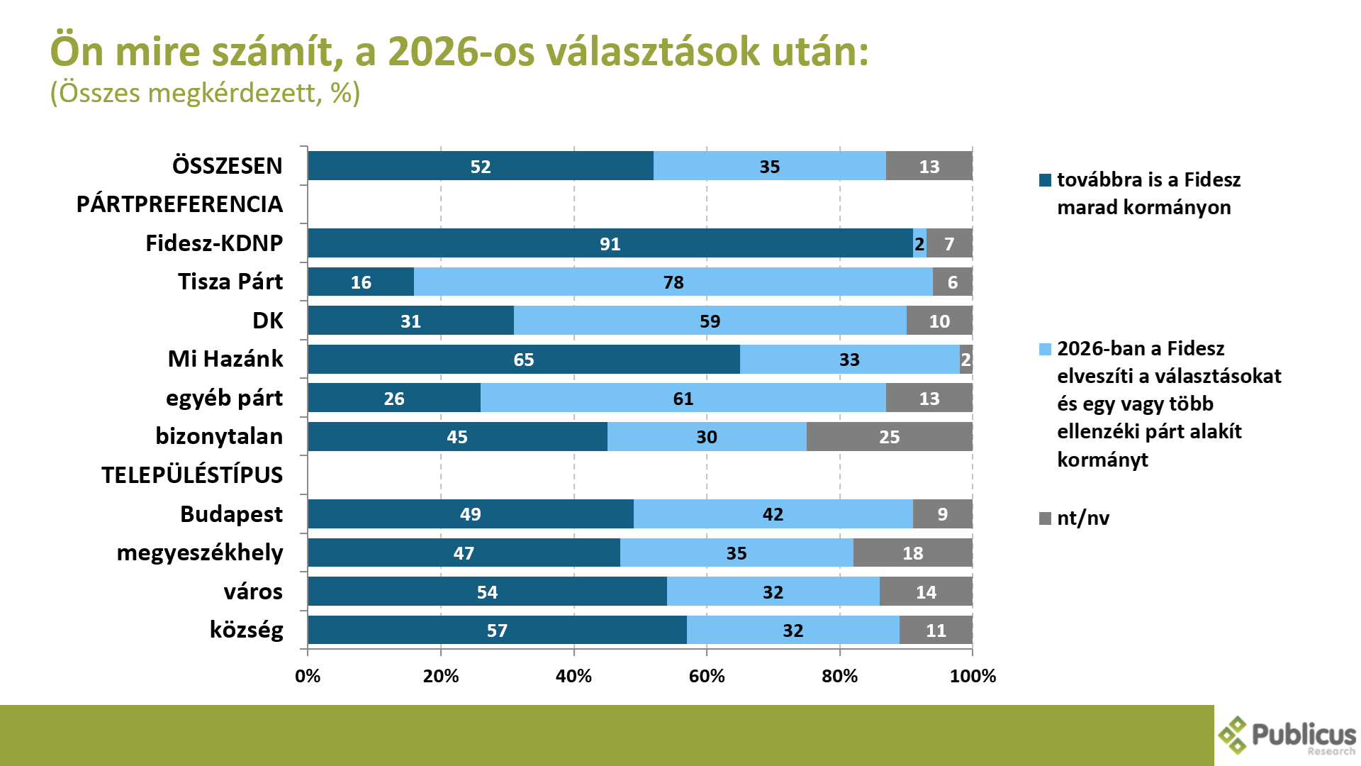 Hiába a személyes preferenciák, a többség (52 százalék) mégis arra számít, hogy a 2026-os választásokat követően továbbra is a Fidesz marad majd kormányon. Így gondolta a tízből kilenc Fidesz szavazó (91 százalék) mellett a Mi Hazánk szavazóinak kétharmada (65 százaléka), a bizonytalan szavazók relatív többsége (45 százaléka), a DK támogatóinak harmada (31 százalék), és az egyéb ellenzéki pártok támogatóinak negyede (26 százalék). Leginkább a Tisza Párt szavazói voltak optimisták, 78 százalékuk kormányváltásra számít 2026-ban – de erre számít tízből hat DK-s illetve egyéb ellenzéki párti szavazó is (59 illetve 61 százalék).