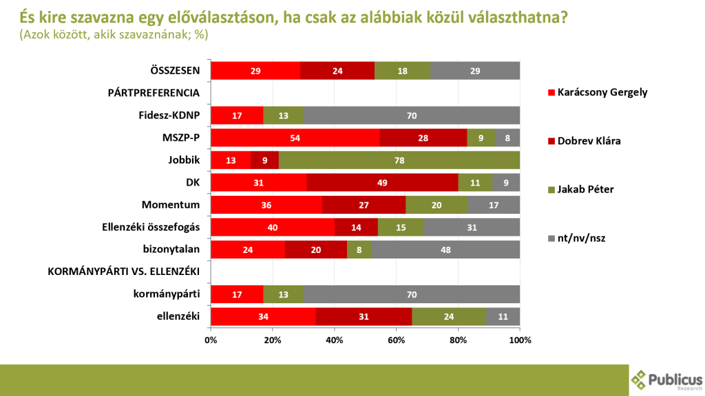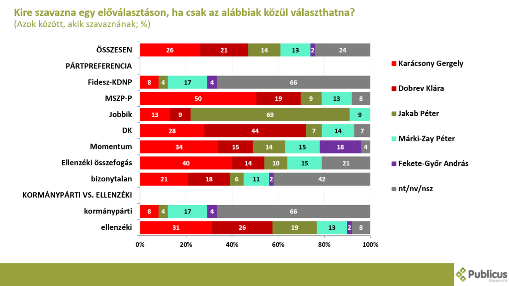 Tízből három (31 százalék) ellenzéki szavazó Karácsony Gergelyre szavazna egy előválasztáson. Dobrev Klárát minden negyedik ellenzéki szavazó választaná. Minden ötödik (19 százalék) ellenzéki szavazó Jakab Pétert választaná, közel minden nyolcadik (13 százalék) pedig Márki-Zay Pétert. Fekete-Győr András támogatottsága itt is 2 százalék.
