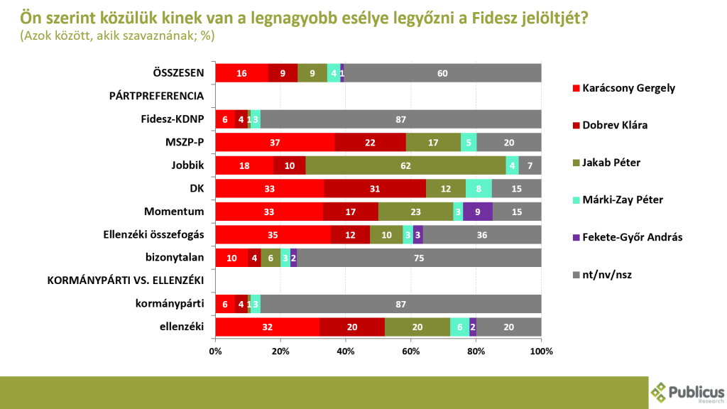 Az ellenzéki szavazók harmada (32 százalék) látja úgy, hogy Karácsony Gergelynek van a legtöbb esélye a végső győzelemre a Fidesz jelöltje ellen. Minden ötödik (20 százalék) ellenzéki szavazó szerint azonban Dobrev Klárának, illetve ugyanilyen (20 százalék) arányban Jakab Péternek van a legnagyobb esélye a végső győzelemre a kormánypárt jelöltje ellen.