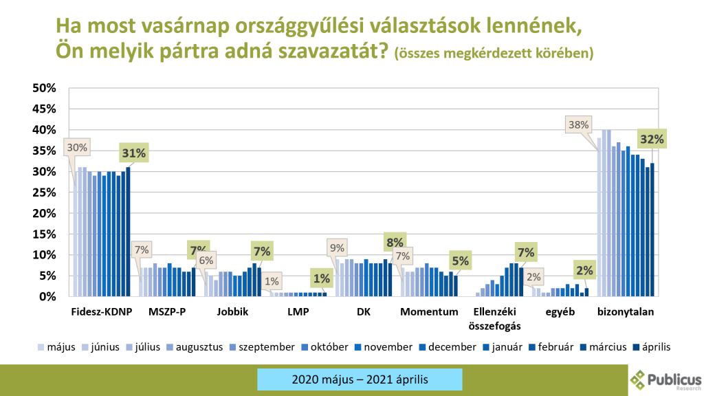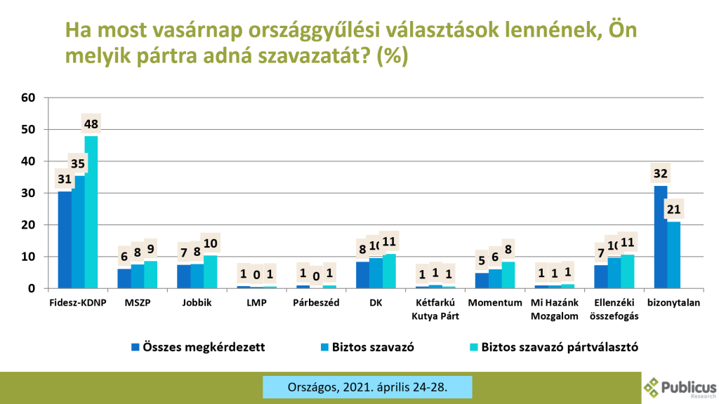 A Publicus Intézet a Népszava megbízásából április 24 – 28. között 1012 fő megkérdezésével készített országos reprezentatív közvéleménykutatásban vizsgálta a pártok támogatottságát és egyes politikusok megítélését.