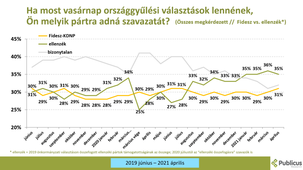 A Fidesz visszaszerzett szavazókat a saját táborából, február óta két százalékponttal (31 százalék) erősödött. Ezzel párhuzamosan az ellenzéki összefogás pártjai némileg gyengültek (35 százalék) így 4 százalékra csökkent az előnyük a kormánypárttal szemben. Ez az előny bár szavazattöbbséget jelentett, a választási rendszer egyenetlenségei miatt mandátumtöbbséget valószínűleg nem.