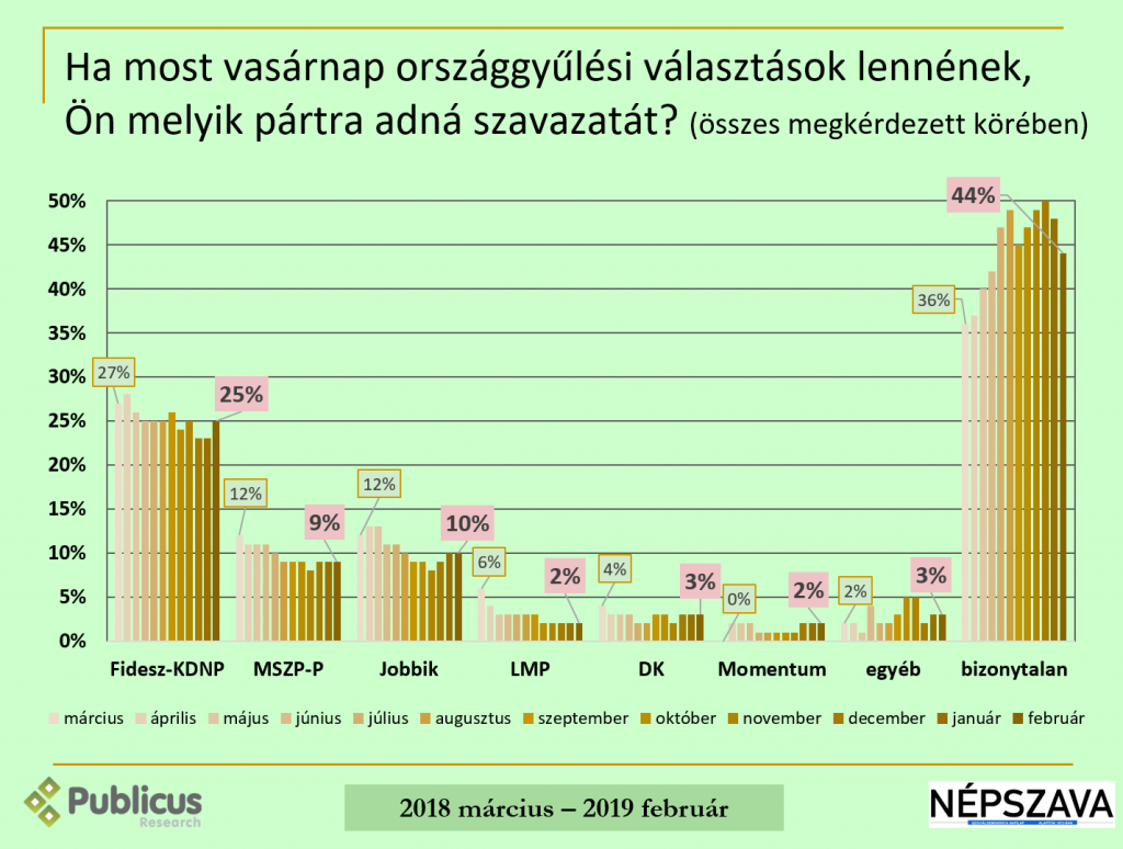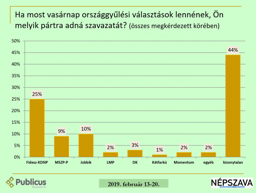 A Publicus Intézet a Népszava megbízásából február 13-20 között, 999 fő megkérdezésével készített reprezentatív közvéleménykutatásban vizsgálta a pártok támogatottságának alakulását, és azt hogy az Európai Parlamenti választások esetén az egyes esetleges együttműködések milyen eredményt hozhatnak. Országgyűlési választások esetén a Fidesz-KDNP támogatottsága 25 százalék, az MSZP-P támogatottsága 9, és a Jobbiké 10 százalék.