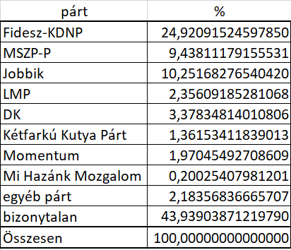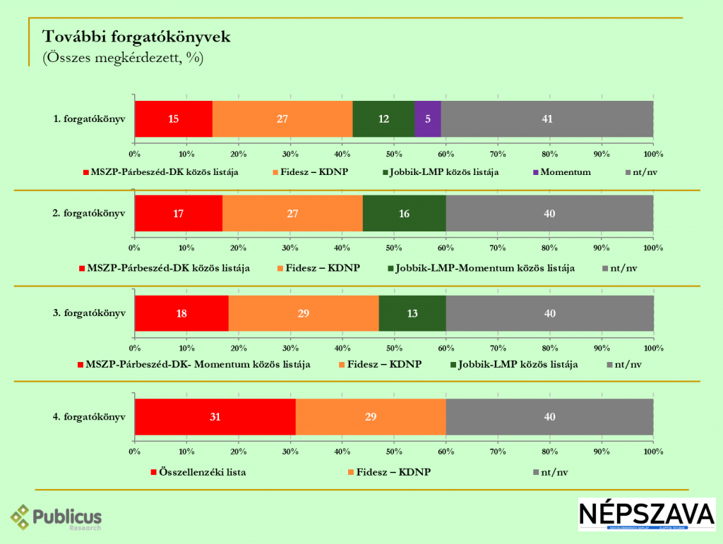 - Ha Momentum nem indít külön listát, és a Jobbik-LMP listához csatlakozik, akkor az a lista 16 százalék szerezne, 4 százalékponttal többet mint az első forgatókönyv esetén. Azonban ekkor az MSZP-P-DK is további két százalékponttal jobb eredményt érne el, 17 százalékot kapna. A Fidesz támogatottsága nem változna ezen esetben, míg a bizonytalanok aránya további 1 százalékpontot csökken.