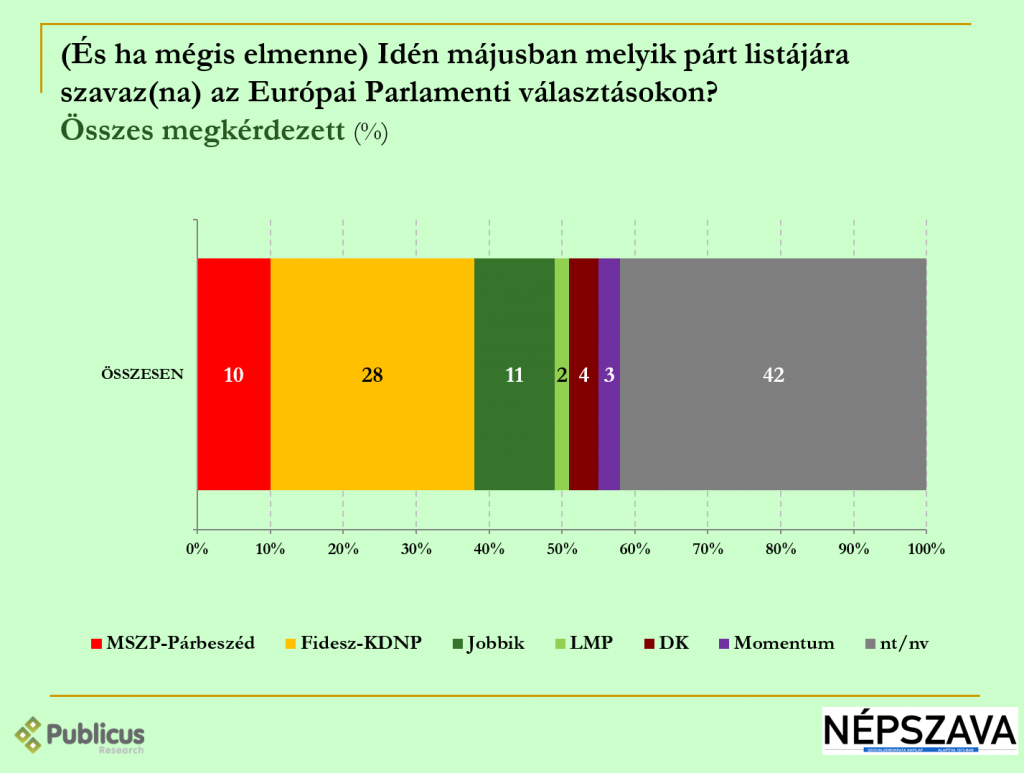 Az EP választáson részvételt tervezők aránya egy hónap alatt nem változott, továbbra is magas. Viszont kb. 10 százalékponttal növekedett az aktív EP-preferenciával rendelkezők aránya. Az összes megkérdezett körében a Fidesz-KDNP 28, az MSZP-P 10, a Jobbik 11, az LMP 2, a DK 4, a Momentum 3 százalékot szerezne egy „most vasárnapi” EP választáson. Minimális eltérések figyelhetők meg az országgyűlési listára leadandó szavazataránnyal összevetve, azonban a kutatás a DK listavezetőjének bejelentése előtt készült.