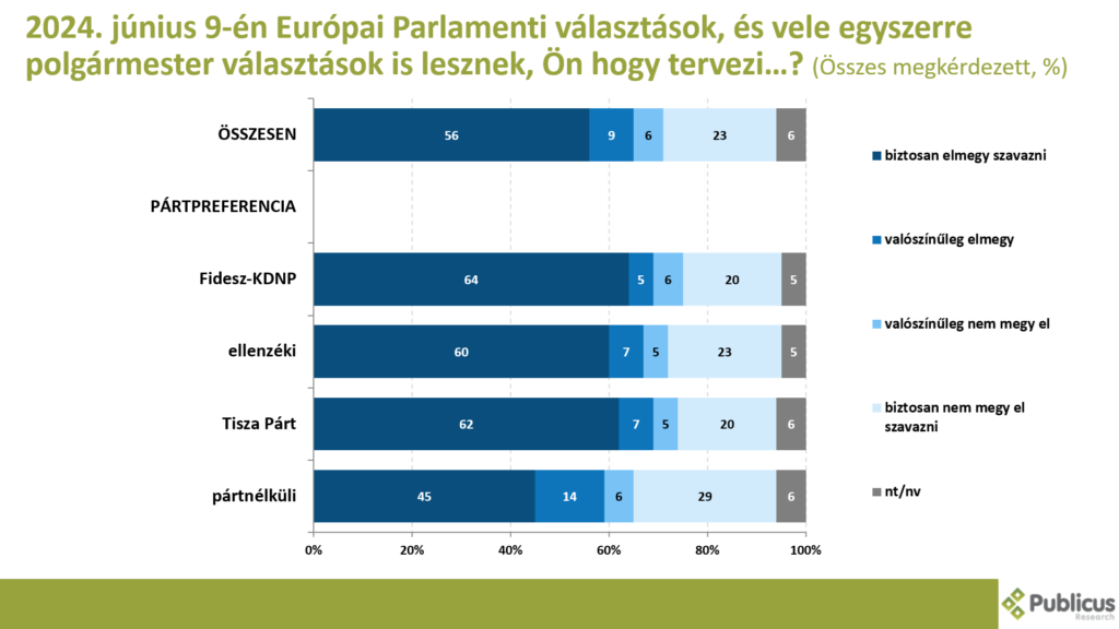 A Publicus Intézet a 2024. június 3 – 5. között 1001 fő választókorú megkérdezésével készített és június 7-én nyilvánosságra hozott reprezentatív kutatása azt vizsgálta, hogy a magyarok szavaznának a 2024. június 9-i Európai Parlamenti választásokon.